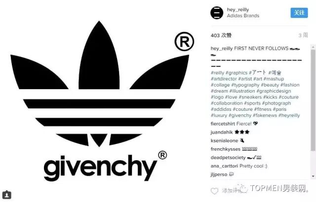 其实这张图最早是出现在擅长解构重组图片的艺术家@hey_reilly的IG上的,你去他IG甚至还能看到GUCCI X PUMA,givenchy X adidas original。