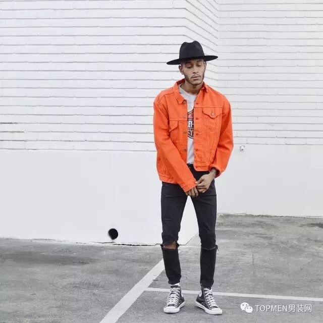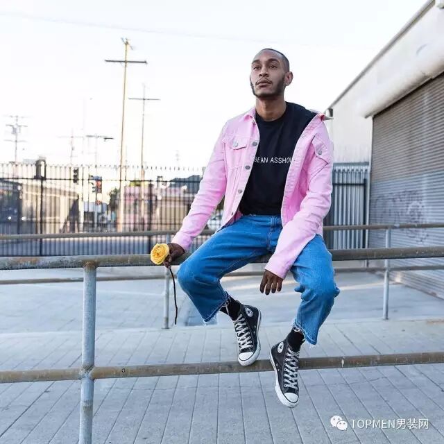 另外,像时尚博主@darion_famous选择的这种彩色的牛仔夹克其实也都不用担心颜色太亮。而且特别适合内搭一件口号Tee或者朋克印花Tee。