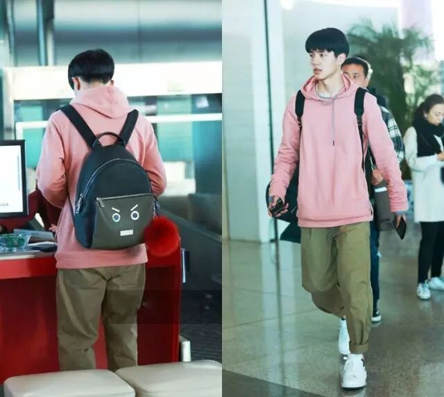 刘浩然粉色puma连帽卫衣和小白鞋依旧清新,可能怕粉色太柔,所以选择了宽松卡其裤搭配,整个视觉效果很养眼。背后的fendi双肩包也挺可爱,这一身很多男生都是可以模仿的。