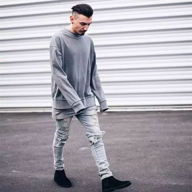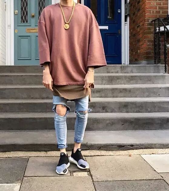 刚才在上面也说了,Oversize 造型的裤子尽可能选择比较合身的,避免在鞋口处堆积得一重又一重,否则加上宽松的上衣,在视觉效果上就会更加拉矮你的比例了。不用猜,你也知道我说的是谁了。