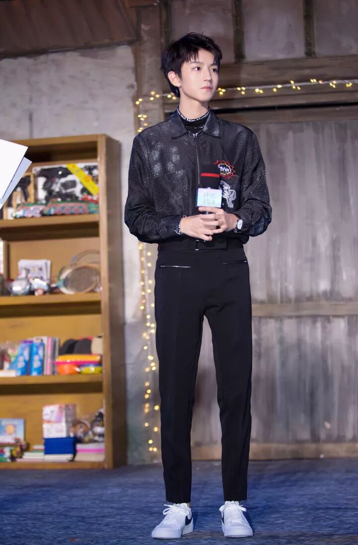 易烊千玺穿着Ferragamo 2017秋冬系列黑色船领上衣及黑色橡胶铆钉底靴子,亮相CCTV-6今日影评特别节目,演绎少年绅士典范,卷裤脚和扎衣尾的穿法瞬间长高10cm。