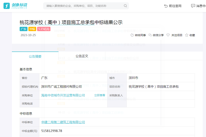 深圳市桃花源学校(高中)项目,中建二局5.15亿元中标