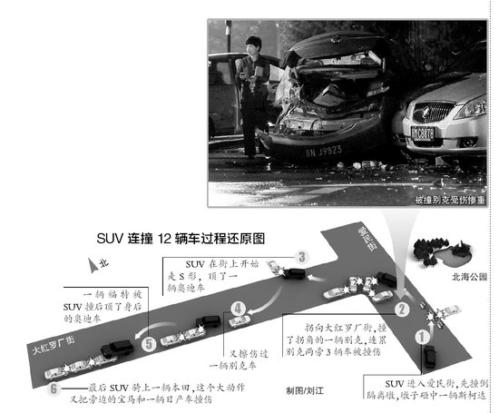 昨晚10时20分许,一辆丰田SUV行驶至西城区爱民街时忽然“发飙”,连顶带撞开出约百米后才停下,身后留下12辆伤痕累累的车。