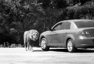 野生动物园内,一头狮子走过,旁边的车就开着车窗