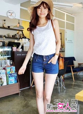 荷叶形遮阳帽+白色背心衫+蓝色牛仔短裤,纤细的手臂以及完美腿型,令人羡慕不已!