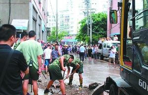 十来分钟后,消防官兵就火速赶到了现场,但消防队员也一时无从下手施救。救援人员立即调派了两台挖掘机,在张鸭子总店附近的马路上挖开下水道,但一无所获。到下午两三点水量变小后,市民们看到,有消防战士从挖开的孔洞进入下水道搜索,但直到昨晚9点仍无结果。