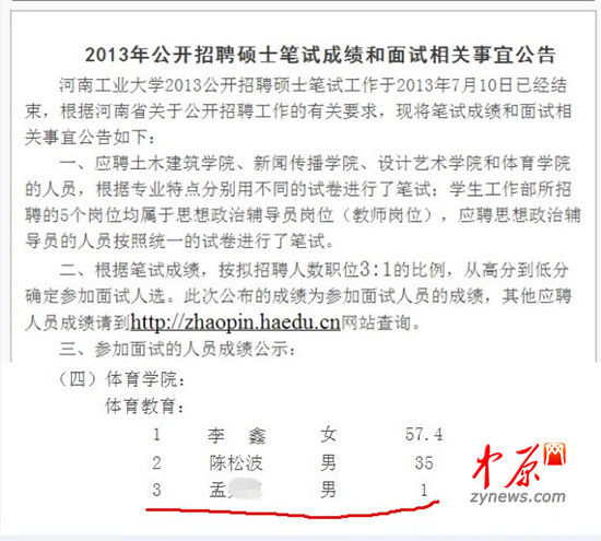 7月12日,河南工业大学公示了招聘人员名单,笔试成绩1分的孟某出围。报考体院学院的李鑫,以笔试57.4分、面试80.14分、综合73.32的成绩,被体育学院乒乓球专业录取。