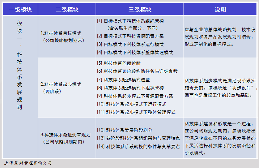 企业科技体系建设工作的第一项任务即是形成科技体系发展规划。该规划的内容框架主要包括三大模块、十四个工作要项。