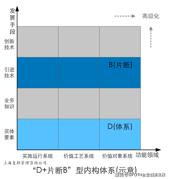 D+引进技术。当产品或技术出现更新换代时,一些企业通过技术引进提升并重塑内构体系,如引入新产品实现价值对象系统再构、引入先进设备或成套技术实现价值工艺系统再构、引入ERP或OA实现实施运行系统再构等;然后,企业凭此赢得的竞争优势和机会,在之后几年里延续D类的发展方式。——后将这样形成的内构体系称之为“D+片段B”模式(如下图),该模式在技术周期性强的行业实践得较为突出(相关研究参见《「案例」我国高技术产品生产企业走出“有量无利”困境》一文)。
