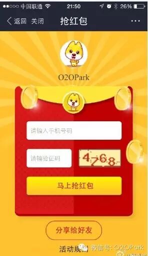 【O2OPark在春节发送10000元二维码卡券的红包,请各位点击微博网址参与,试试你的手气!】