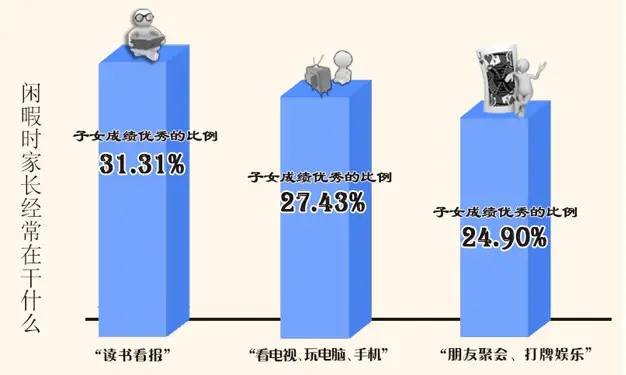 数据显示,“阅读型”家庭子女成绩优秀的比例更高。闲暇时父母经常“读书看报”的家庭中,其子女成绩优秀的比例为31.31%,高于“看电视、玩电脑、手机”(27.43%)、“朋友聚会、打牌娱乐”(24.90%)等家庭。