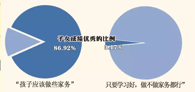 这样看来,并非把所有的时间都留给孩子学习和休息才是明智的选择。那些认为“只要学习好,做不做家务都行”的家庭中,子女成绩优秀的比例为3.17%,而持有“孩子应该做些家务”观点的家庭中,此比例为86.92%,两者相差悬殊。