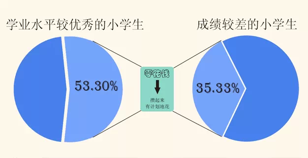 在成绩优秀的小学生中,随自主管理零花钱能力的提高,其学业优秀的比例也直线上升。53.30%学业水平较优秀的学生会将零花钱“攒起来,有计划地花”,比成绩较差的小学生高17.97%;相反,随心所欲,给多少花多少的学生中,成绩较差的为13.91%,学业水平较优秀的仅为3.12%。