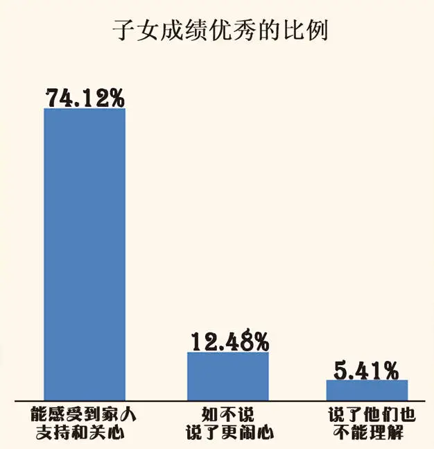如当父母情绪不好时,“能感受到家人支持和关心”的家庭,其子女成绩优秀的比例最高,为74.12%,而冷漠、疏离的家庭中,如“不如不说,说了更闹心”和“说了他们也不能理解”,子女成绩优秀的比例仅为12.48%和5.41%。