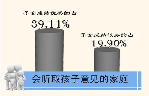 成绩优秀的学生家庭更多采用协商、民主的亲子互动模式。数据显示,“会听取孩子意见”的家庭,子女成绩优秀的占39.11%,而子女成绩较差的比例仅为19.90%。