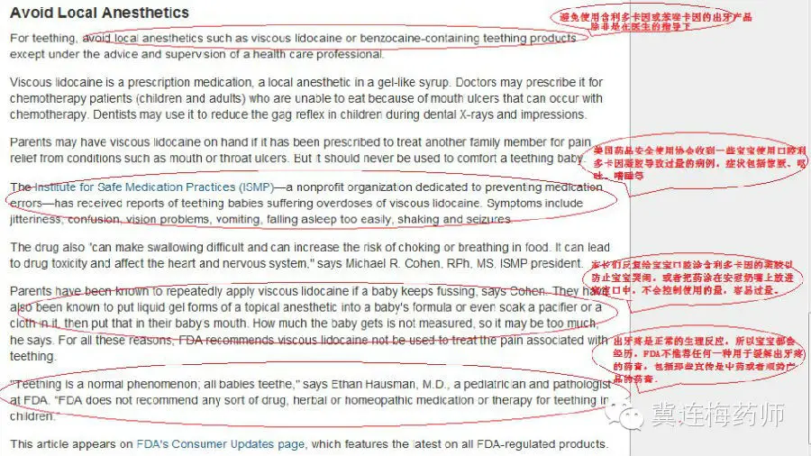 benzocaine)都属于局部麻醉剂,常常用于手术时的止疼和麻醉作用,可以阻滞我们的神经,让我们感受不到疼痛;做成口腔凝胶使用时,常常用于严重口腔溃疡的短期使用。2012年,美国药监部门FDA和中国药监部门CFDA都对苯佐卡因凝胶相关的高铁血红蛋白症风险发布了不安全的警告,禁止2岁以下儿童使用此类凝胶。最近,FDA对含利多卡因的凝胶发布了下列风险警告(见图),不建议家长们为缓解宝宝出牙疼而使用含利多卡因的凝胶!英文好的看原文,习惯中文的看红色字体。
