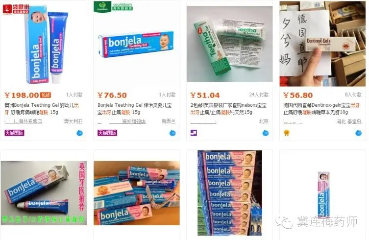 我们小的时候,出牙是否感受过疼痛?这个问题估计大家都不记得,那时的年龄还太小。如果问我们的妈妈,在我们出牙时是否用过药物给我们止疼?我猜100%的妈妈会回答没有。我们的妈妈都知道出牙疼痛是最自然的生理过程,每个人都会经历,反倒是生活在现代的一些妈妈被商家忽悠得忘了这一基本常识,所以才会有某宝上出牙止疼药膏也会销售火爆的场面,截图是我用“出牙凝胶”检索出来的页面,上面的产品来自世界各地,有澳洲的、英国的、德国的、日本的。点开链接进入产品介绍页面,无一例外说的都是产品的好处,很少有人会如实标注这些产品里的化学成分,比如“利多卡因或者苯佐卡因”(lidocaine
