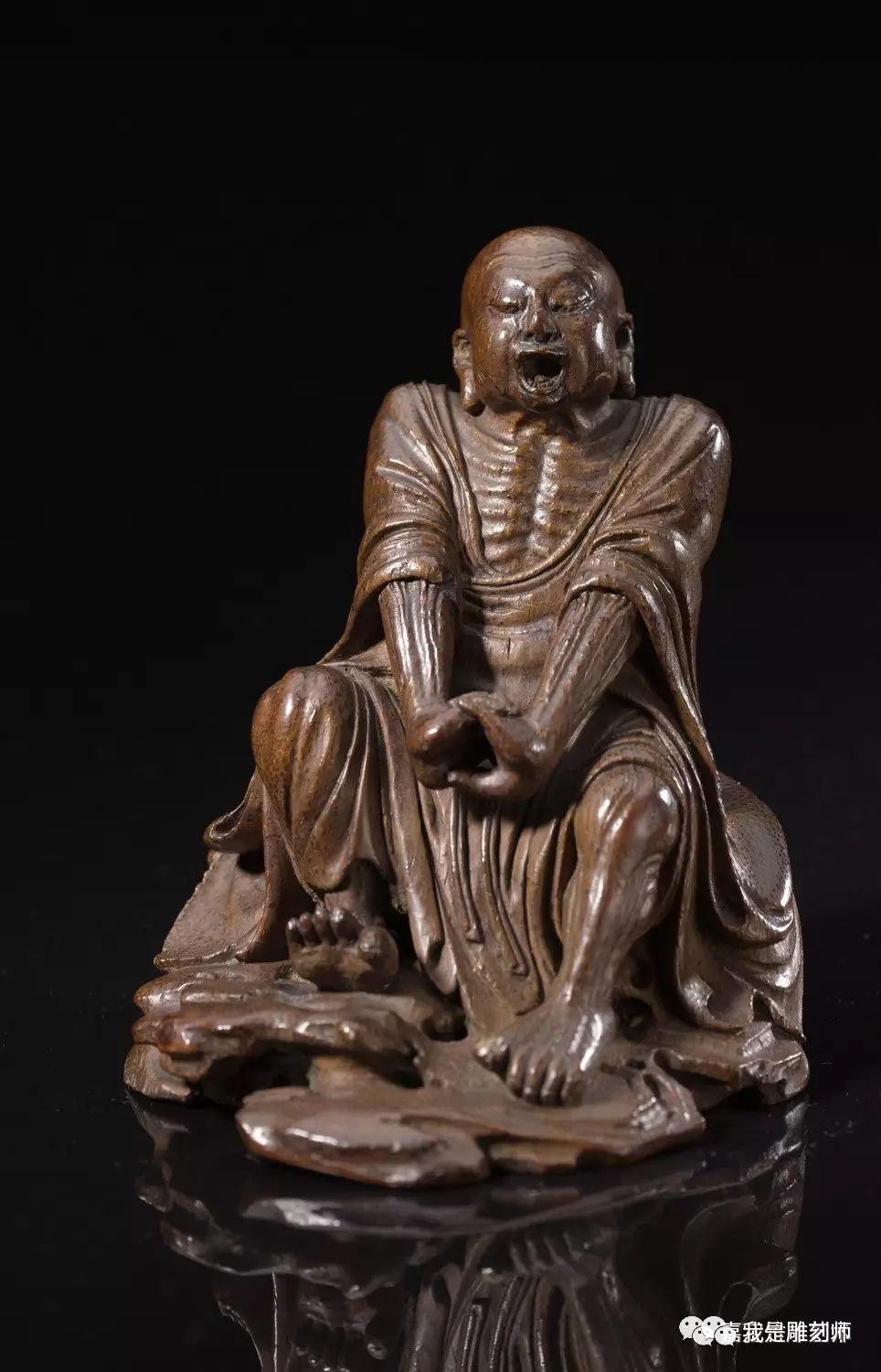 1.圆雕。也称立体雕。竹根圆雕的题材通常有人物、动物、花果、树桩、山石器皿等。制作过程大体分三步:先制粗坯,用凿刀法,雕出造形轮廓,强调细部结构。然后作修光,先用割刀法,用斜口刀割出线条以及线条与阳面的过渡,阴的弧面用圆刀修饰,结合其他刀法修光。人物、动物的开相放在最后进行,而毛发的处理用三角刀来刻画。数种刀法交替并用。然后打磨抛光。充分巧用竹根天然形状与根须疤痕的自然肌理,因材施雕,塑造形象。代表作为上海博物馆收藏的封锡禄“圆雕罗汉”[图一]、邓孚嘉“圆雕陶渊明赏菊”[图二]。