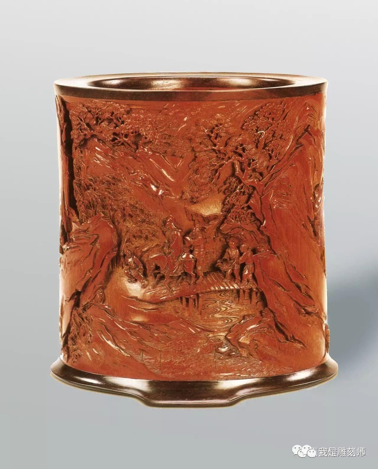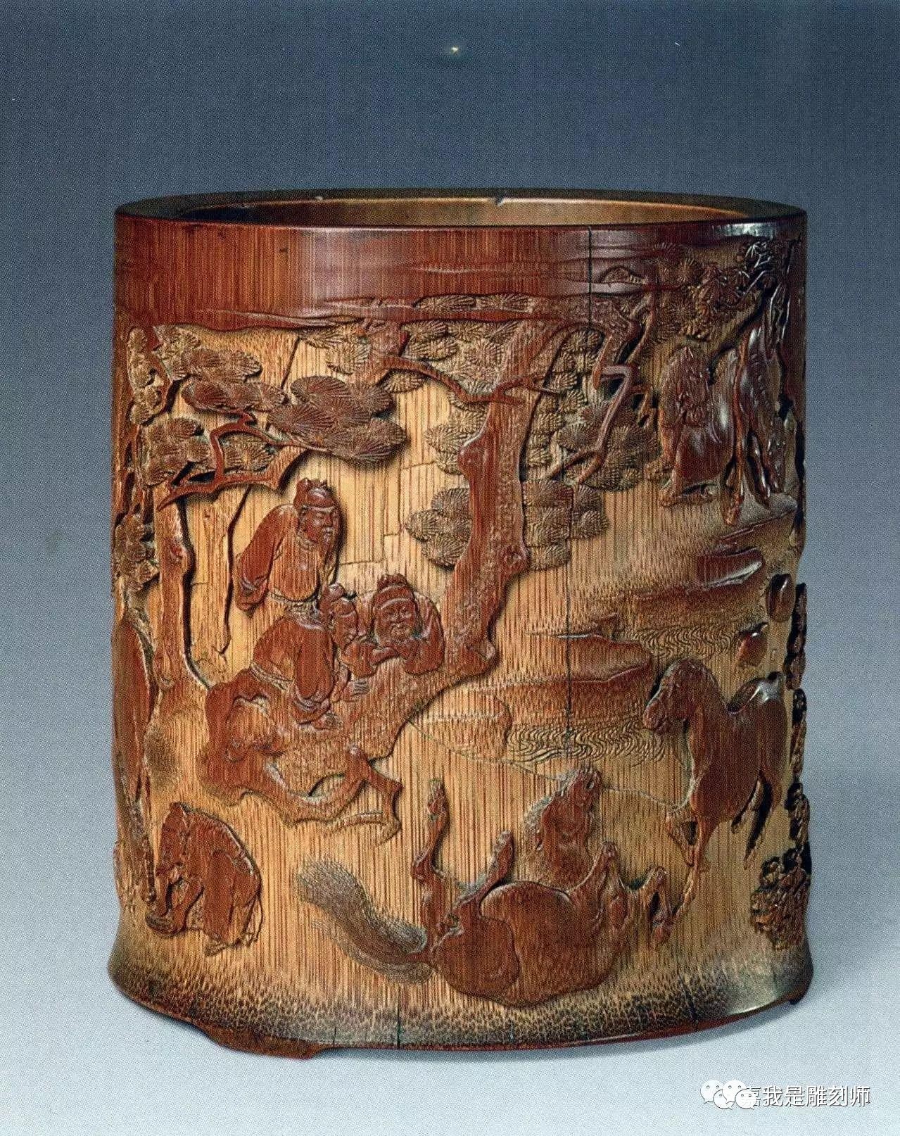 3.浮雕。分两种:高浮雕(也称深浮雕)、浅浮雕。赵昕《竹笔尊赋序》:“一尊之间,因形造境,无美不出。漥隆浅深,可五六层,漏沉其次也。”寥寥数语,已道出高浮雕之特点。为使景物层次分明,使高处更高,低处更低,故雕刻亦更深。金西厓《刻竹小言》论及高浮雕,有“至于雕刻工具,一般竹刻所用之三五小刀,已不敷用,须有圆口卷凿,宽刃扁铲,用之于凿毛坯,辟画境。先有大开大合,始能有细凿精镂也”之语。与其他竹刻形式相比,刀具繁多,雕刻语言也最丰富,费时也最多。每成一器常历一年半载。因稿本只在其表,不及深处,创作时需随铲随画,故更能见作者巧思。此法最适合于全景处理。代表作为香港佳士得2005年拍卖的顾珏“山水人物图”笔筒[图四]。浅浮雕在雕刻层次、深浅方面,界于高浮雕与薄地阳文之间,比高浮雕薄,压缩比例也大,通过铲去竹地,留出凸起的花纹,高低相衬,虚实相生,产生层次,分出远近。代表作为故宫博物院收藏的吴之璠“松溪浴马图”笔筒[图五]。