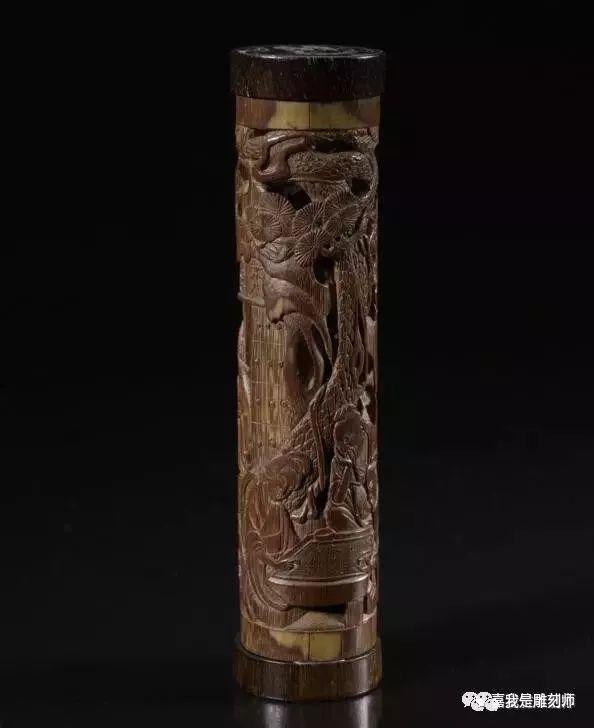 2.透雕。适合于近景处理。把画面的留白处镂空,突出物象,虚实分明。镂孔处的大小、正斜应与物象呼应,亦随物象而变化,以虚空间来衬托实体,更好地突出主体,使整件器物更显空灵、幽浑。镂空时以切刀与挖刀为主,其他用刀与浮雕相同。此嘉定竹刻在明、清初之主要特点。代表作为上海博物馆收藏的朱小松“刘阮入天台”香薰[图三]。