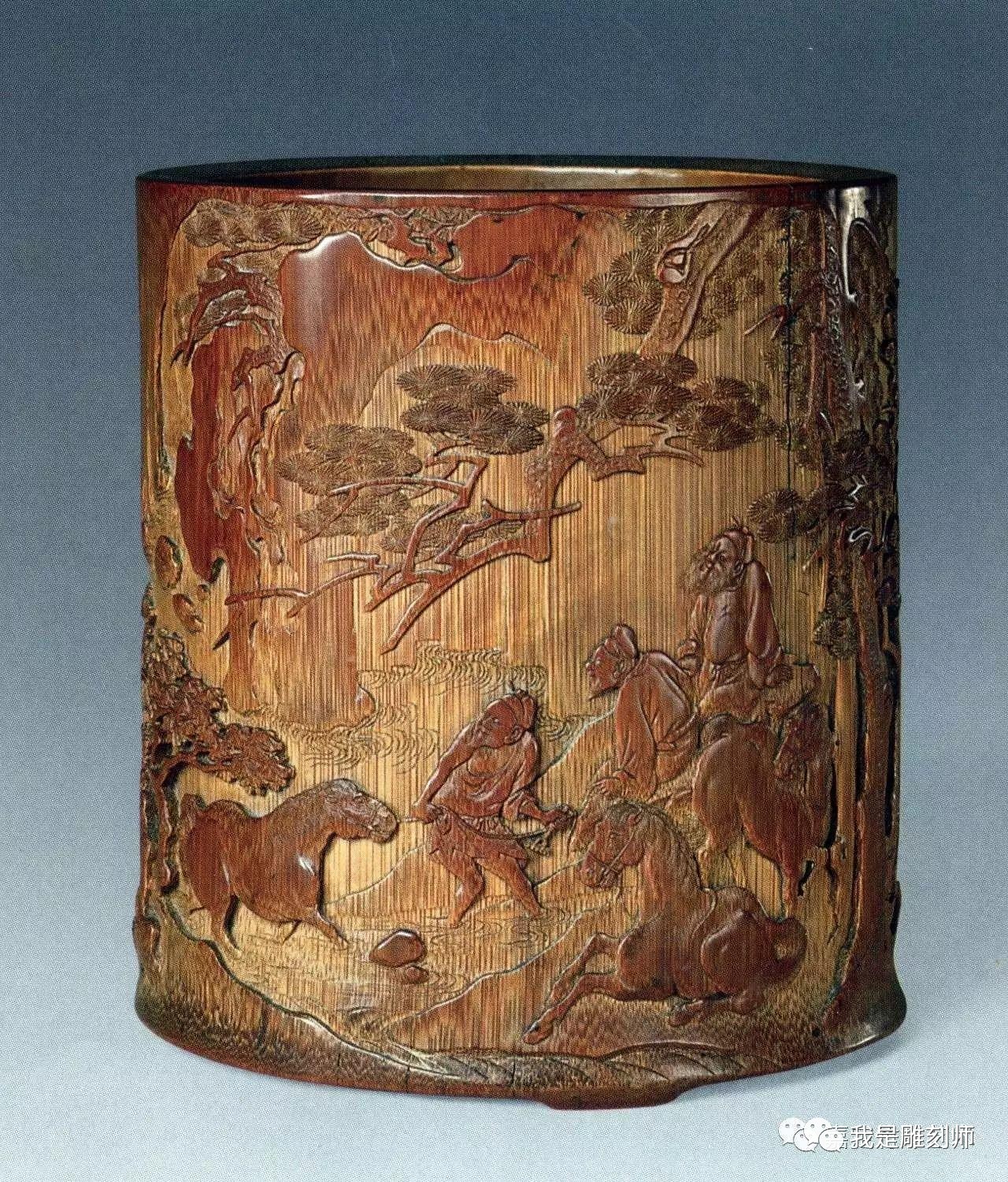 [图五]清 吴之璠 竹雕松溪浴马图笔筒