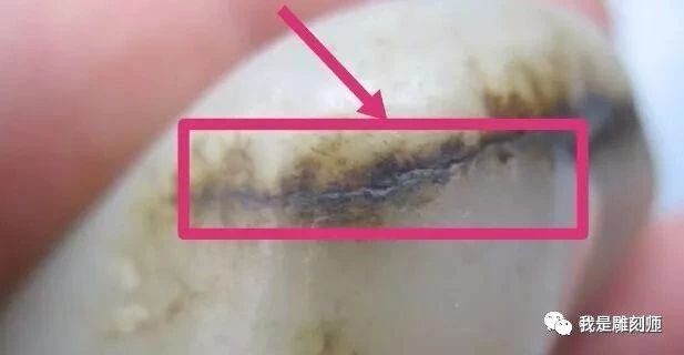 当然,如果你再深入地研究,你会发现,在放大镜下的水草沁,它的纹路边缘是一种扩散状态的,感觉像是蜈蚣的脚一样,同时你还能够从这些纹路分布状态中看出玉石裂纹的方向及其深浅程度。