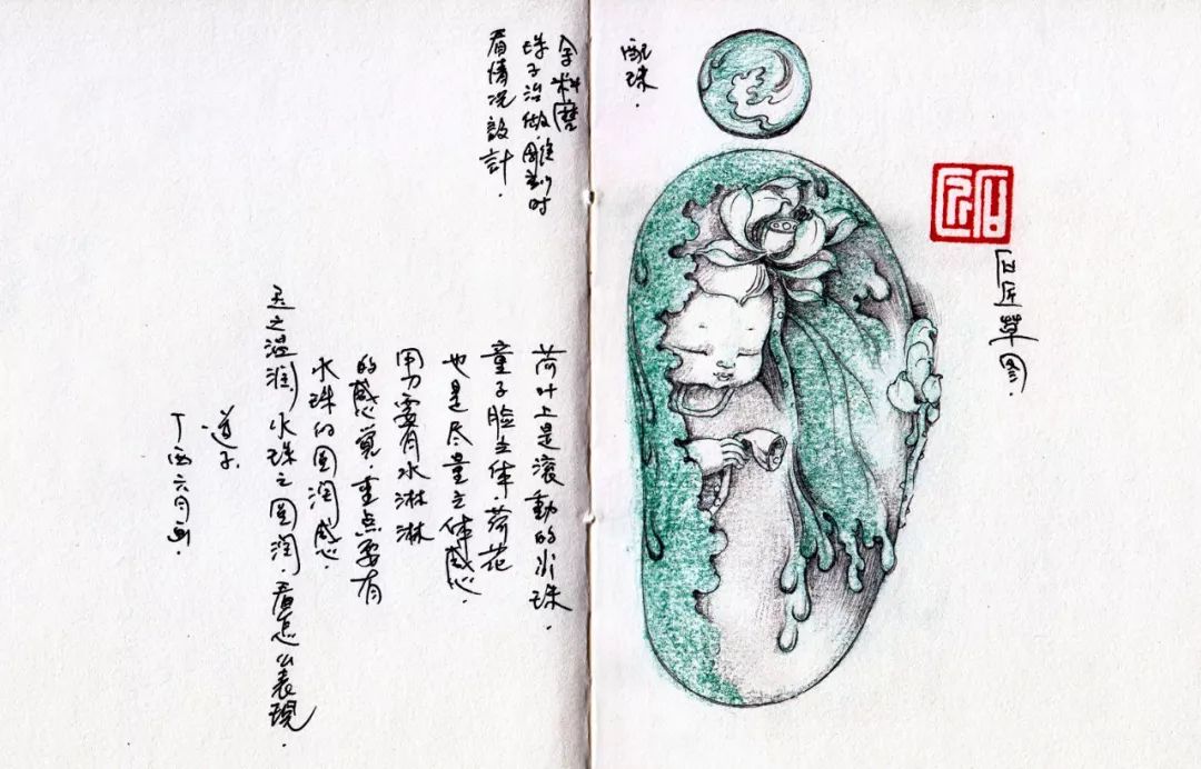 扎实的绘画功底是一件作品的成功基础,好的设计会让作品“熠熠生辉”。很多玉雕师为了利用好原石,往往都会在纸上设计很多种不同的题材。综合考虑,最终确认最后的题材。