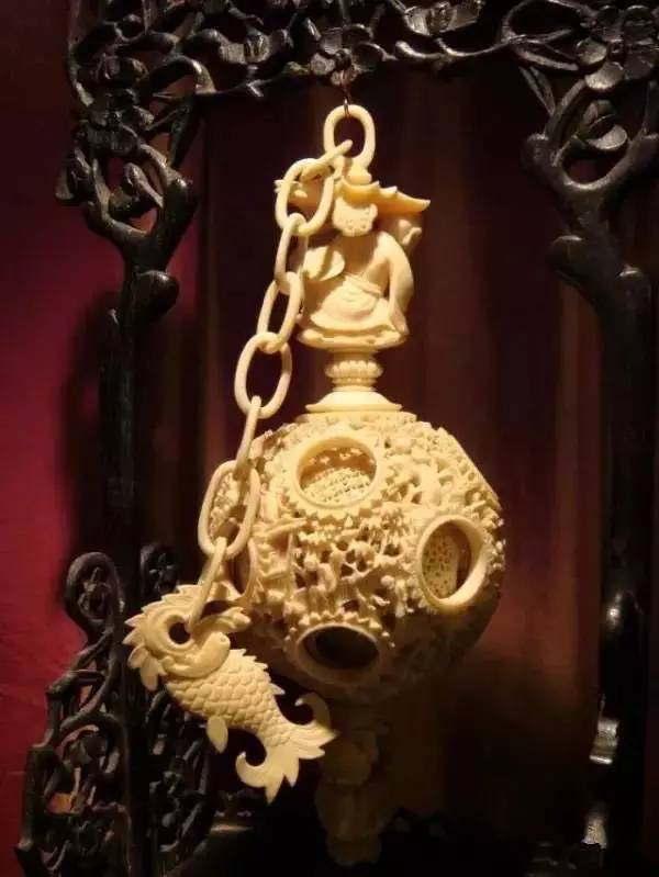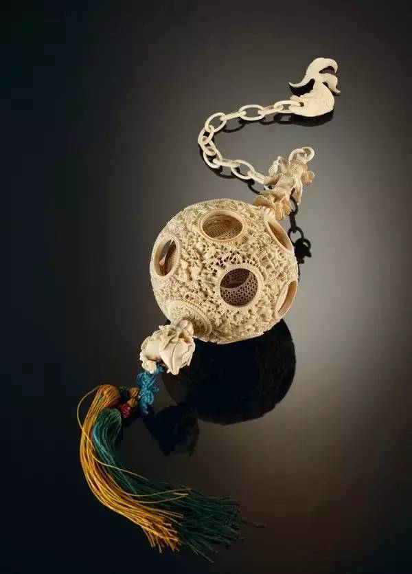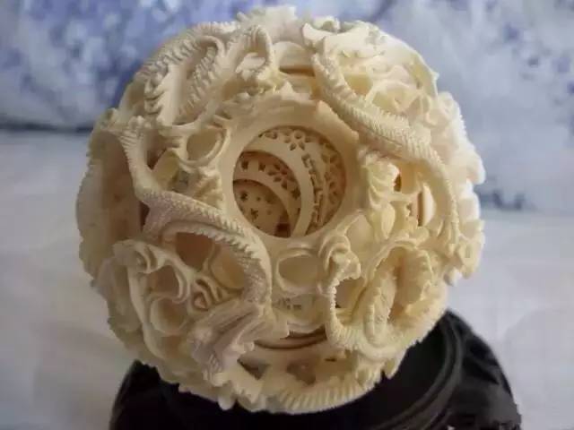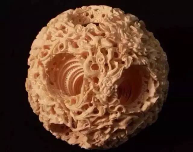 “鬼工球”又称“牙雕套球”,是通过高超的镂空技艺用整块象牙雕出层层象牙球,且每层象牙球可以自由转动,上面再雕有纹饰,是精美绝伦的中国国粹。早在上世纪初,中国广东牙雕艺人翁昭手工镂雕的一件26层“鬼工球”就让日本的胶粘牙雕灰头土脸,最终赢得巴拿马博览会金奖。
