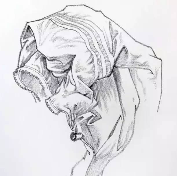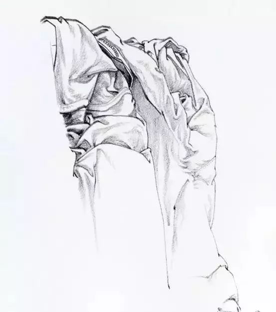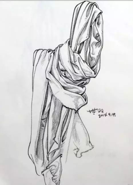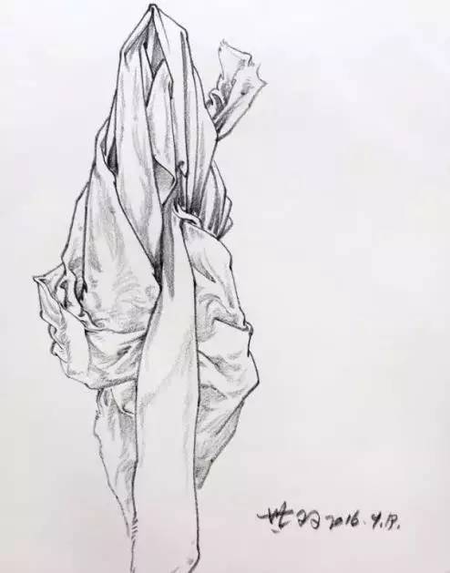 布是没有线的线,是体面的转折面缩小后就形成了我们所说的线,所以我们在画线时要有体面意识,在布的转折处松,垂下的边角处线与线的交汇处不要接死,流出一定空隙就可以体现布料的厚度了就像我们在画罐子口和盘子时一样。当你离布折10厘米近距离观察时会发现这一点。