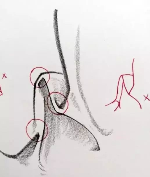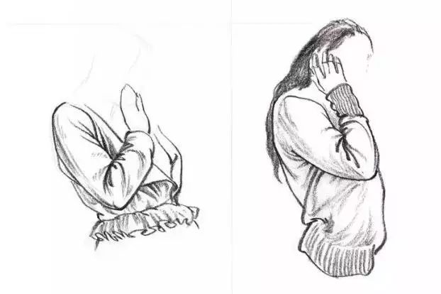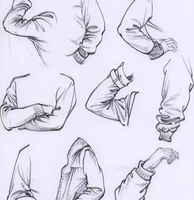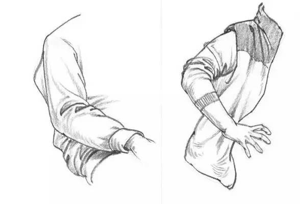这是人体几个大的转折部位,此处的衣折多由于挤压形成,挤压的布折有个特点就是——密,所以这部分的布折也是所有学生都最为困惑的部位。原因在于太密学生就懒得仔细观察,瞪大眼睛也看不出个究竟,最终就放弃了。其实只要认真的研究一次就解决了,具体做法如下:以自己的肘部或膝部作研究对象当你伸直胳膊时是没有衣折的,你可以试着慢慢的弯曲胳膊同时仔细观察衣折的变化一个、两个、三个随着胳膊的不断弯曲衣折越来越多越来越密再试着重复几次你会发现,布折位置几乎没变不管你弯曲几次它们还是按照第一次出现的顺序依次出场,因为我们的胳膊的结构始终没变,这就是人体结构对我们衣褶联系的主要影响。