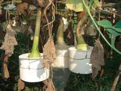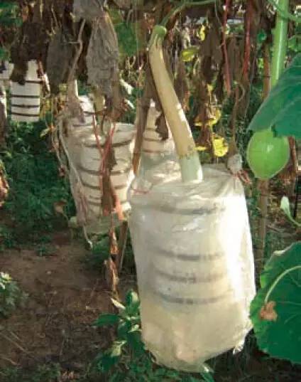防雨、防高温遮盖将葫芦套上石膏模具后,要及时在石膏模具上方套上塑料防雨袋,在7~8月份的时候,在葫芦棚架上方覆盖遮阳网降温,防止高温的危害。