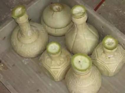 套模后,约经过40天生长后,范制的葫芦基本成熟,将连同模具的葫芦一并采收,采收后连同模具的葫芦放置10天左右,使其自然脱水后开模,开模时用锤子、錾子轻轻将石膏模具打开,把葫芦取出准备后处理加工。