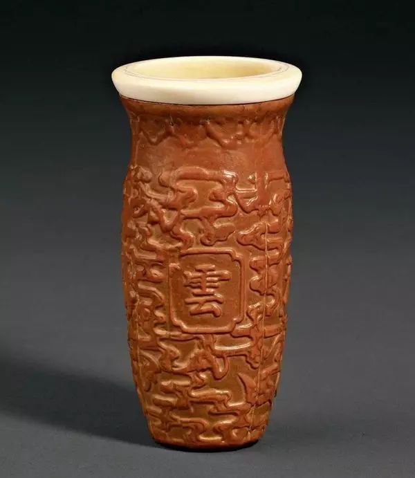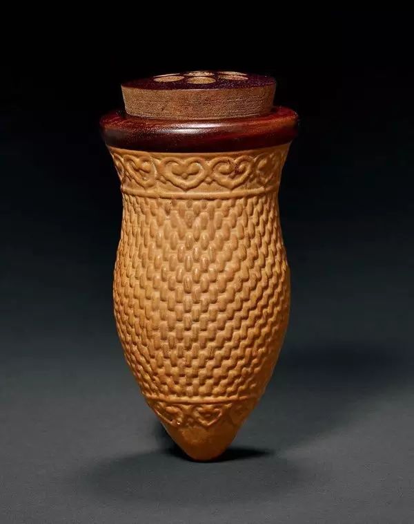 鉴赏:此为畜养蝈蝈之葫芦,束颈、鼓腹、尖底,包浆莹润,色泽深黄,应为盘玩许久所致。周身随形模印笸箩纹为饰,似汲水之柳罐,底部饰四如意头纹。模印纹饰清晰,且极为立体凸出,而范痕几乎不见,已接近官模子特点,属清代安肃模制作精细者,颇为考究。原配口框和瓢盖,瓢盖镶嵌,较之常见的素面瓢盖更为讲究。而安装瓢盖者,虽取材、制作相对较易,但为使鸣虫发声达到最大效果,须不断试用不同厚度、不同孔数、不同孔径及孔聚、孔散之盖以求之,真正养虫家无不用此。
