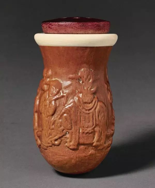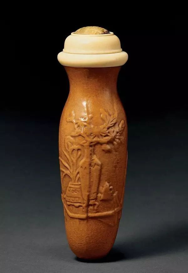 鉴赏:此为畜养蝈蝈之葫芦,几乎不见范痕,色如蜜蜡,包浆厚重。周身模印“五子登科”、“太平有象”图;一侧五位孩童手执各式童玩,嬉戏于庭园之中,均天真活泼,灵动可爱,另一侧宝象憨态可掬,背驮宝瓶,瓶中花卉及象身流苏搭披等细节刻画生动。葫芦模印纹饰清晰,且极为立体凸出,而范痕几乎不见,接近官模子特点,属清代安肃模制作精细者,颇为考究。