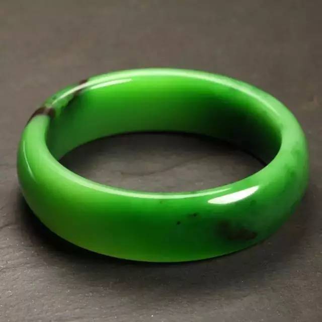 与上一件作品只有一处糖皮不同的是,此款玉镯两面皆带有黑色糖肉(糖肉在白玉上显现为红糖色,在碧玉上则呈现黑色),但玉镯整体色泽翠碧、秾艳,质地也是细腻缜密。