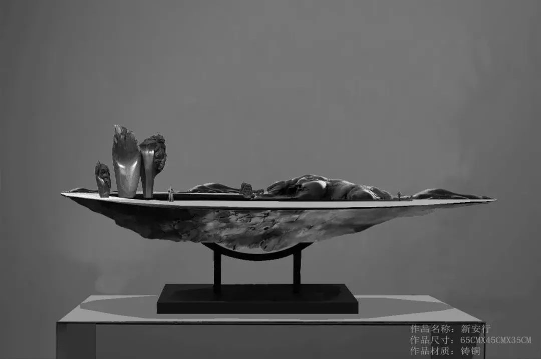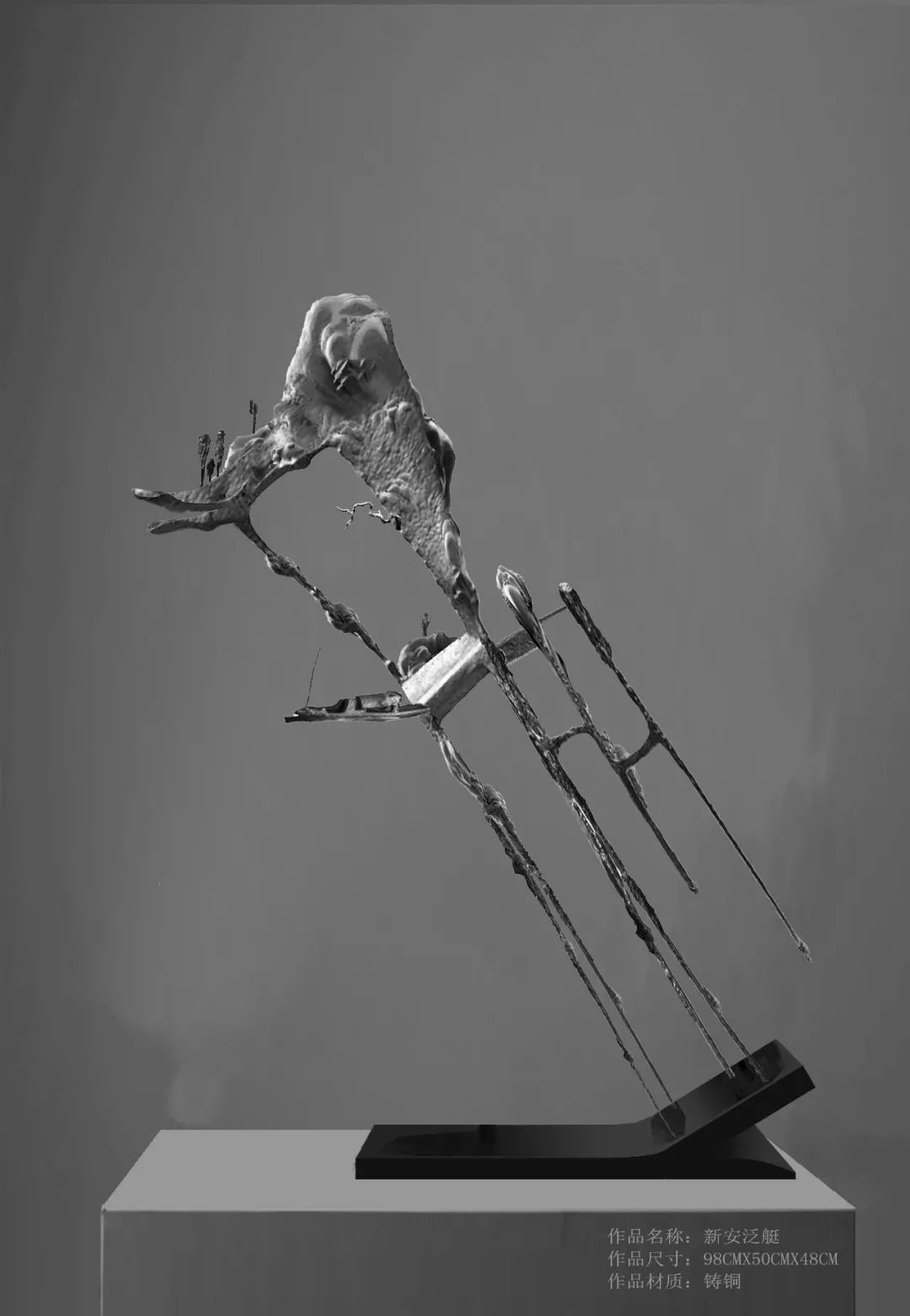 就其语言而言,依旧简淡清远。如作品《我疑虚静乐山水》,铸铜而成,取自《倪昭卿赋赠叶神童·其一》之诗意:“我疑虚静乐山水,来归旧隠挂冠緌。愿策浮云飞碧落,致身绛阙长相随。”作品借用了玉如意的造型,塑造了一段婉转曲折的“天梯”,烟波浩渺的水面任意飘荡着一叶轻舟,一个策杖独行之人弃舟登岸,远离险恶的江湖或叵测的宦海,向心灵栖息的巅峰缓缓地跋涉、攀登。再如作品《新安泛艇》《新安行》《新安行旅》《新安山水》《雪望》等。作品的着墨并不多,在具体的塑造上不逞技巧,点到为止。使用的语言简洁明快,并无多少含混隐晦之处,指向鲜明。