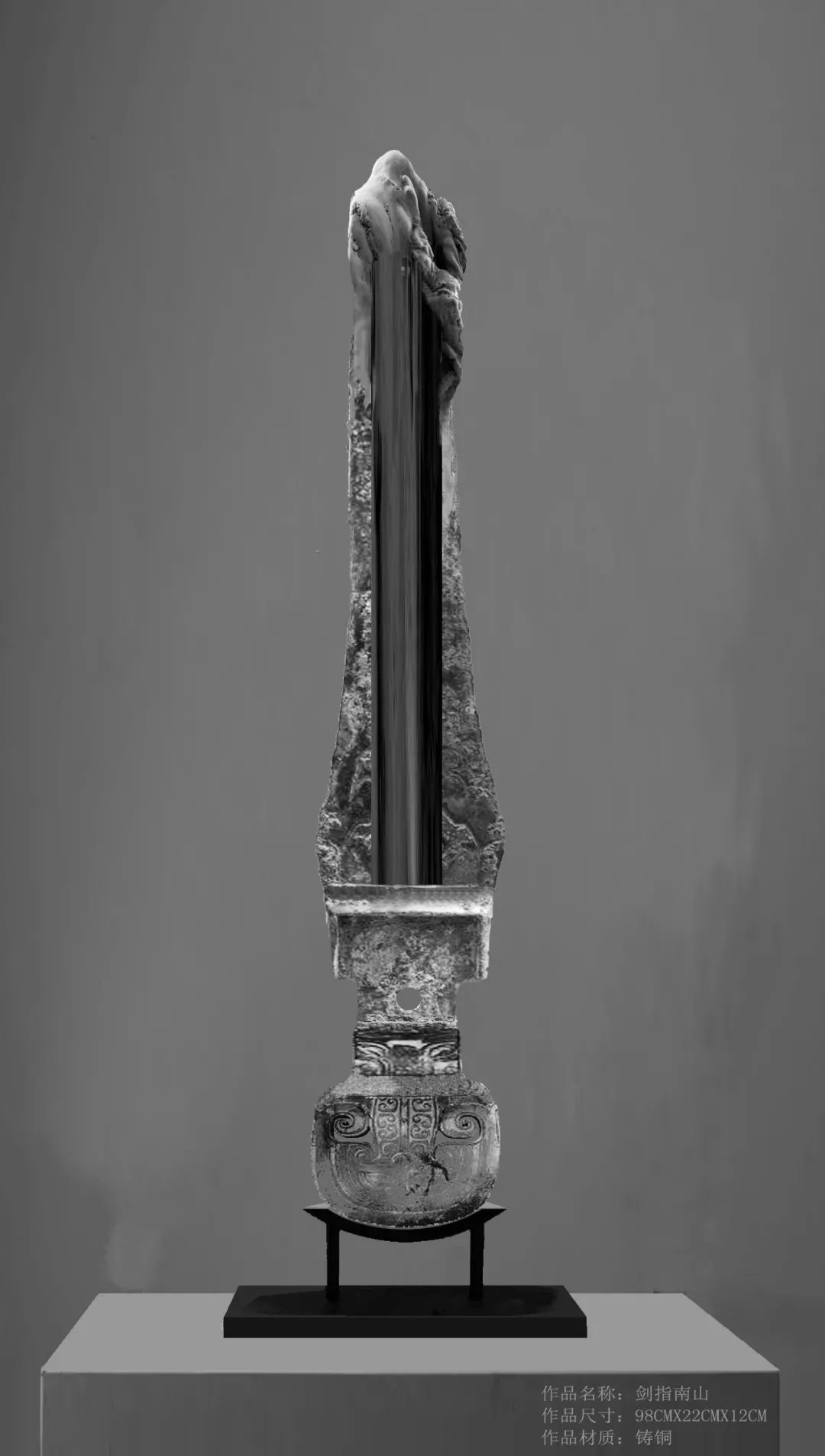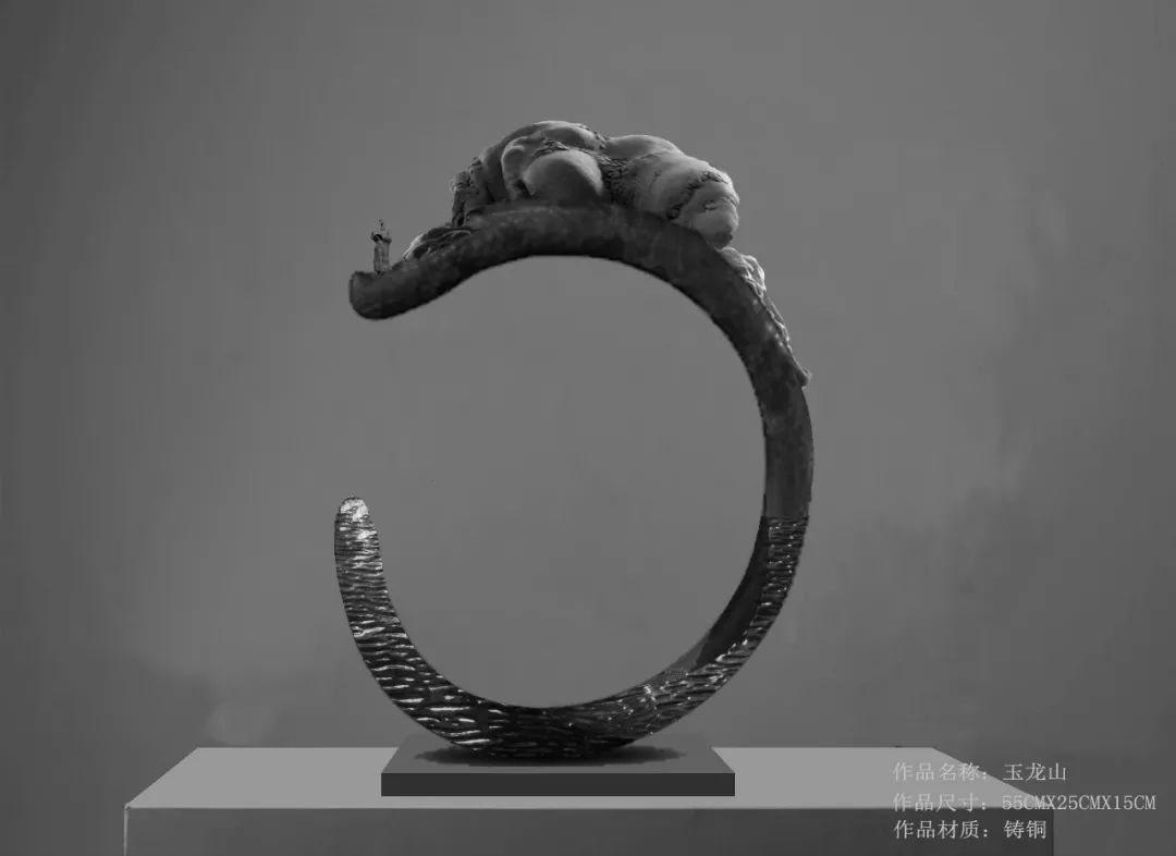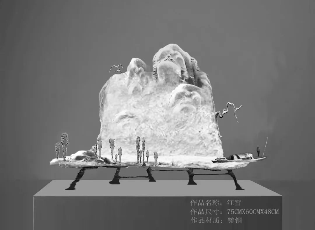 就其样式而言,依旧与众不同。杨泽银的这组山水雕塑之中,有些造型借鉴了古代绘画和工艺美术品,将山石的皴法、树法与之融合为一,这是别有意味的一种“构造”。虽然,就雕塑造型而言,“构造”主要是指多种材质、技法的生成手段,但是也还包括多种文化、艺术形式的融合。泽银的这组作品,属于后者。如作品《新安山水》《山中问答》则取自人物造型,《我疑虚静乐山水》取自玉之如意,《新安行旅》取自官帽大椅,《玉龙山》取自猪嘴玉龙,《剑指南山》取自倚天宝剑,《白云泉》取自飞翔之鸟,《望江南·新安雪》取自匍匐之兽。他的这些作品,跳出了山水雕塑的传统模式,没有流于程式化、表面化的模拟与再现。