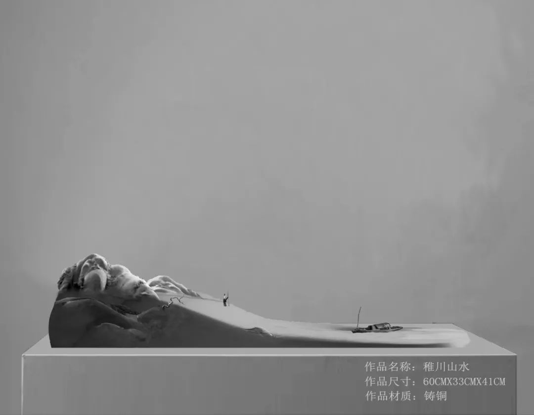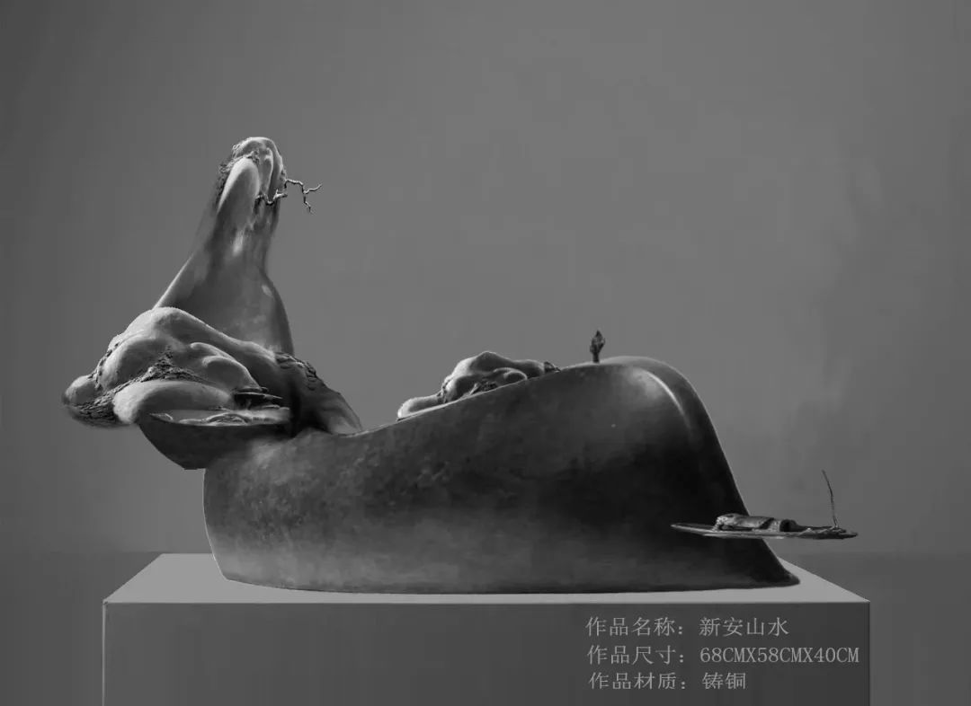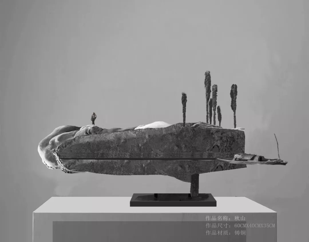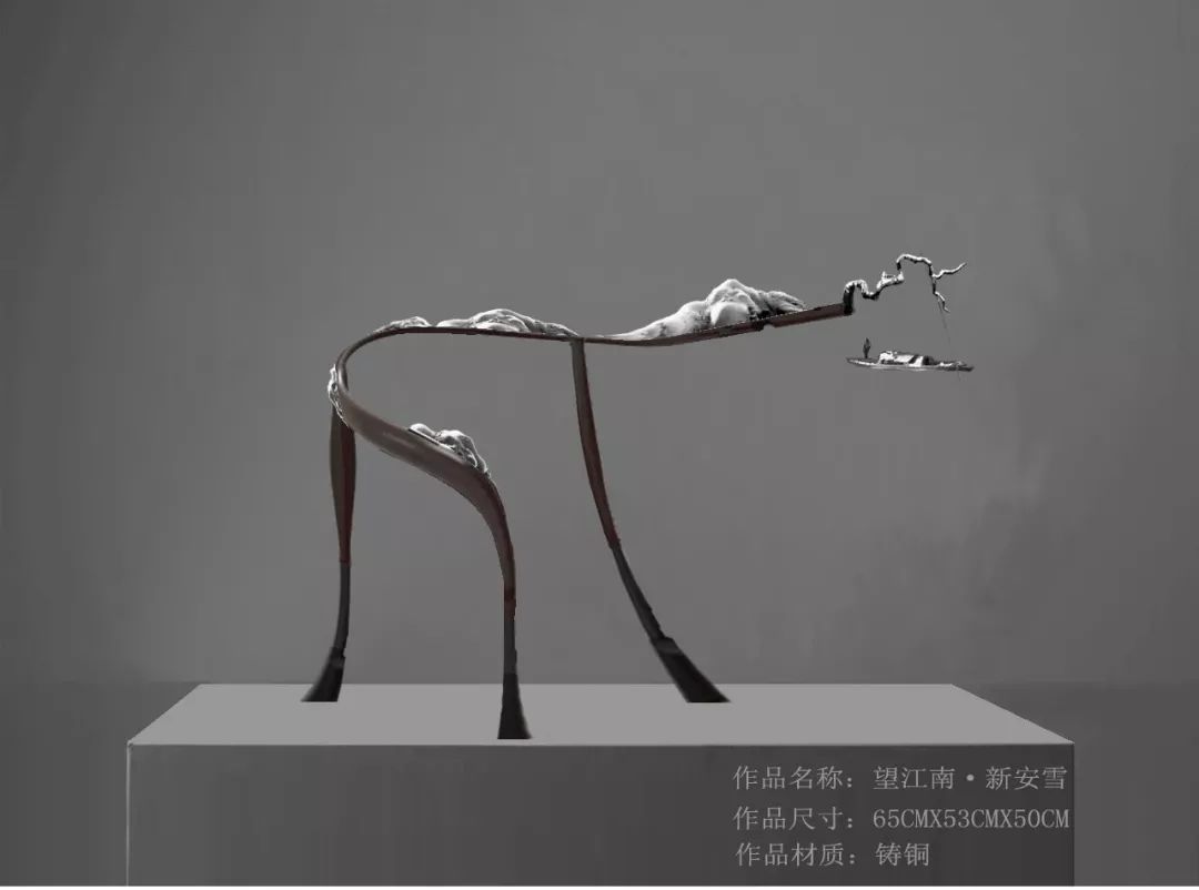 就其意趣而言,依旧荒寒冷默。如作品《新安山水》为铸铜成型,一座独峰,一道山岭,一株孤松,一个行旅,一叶轻舟,增多则赘,减少则缺,荒凉至极。再如作品《稚川山水》也属铸铜,与《新安山水》异曲同妙。所不同者,《新安山水》为纵横交错的立体空间,如同凭几而卧的高士。而《稚川山水》则如一横幅图卷,如平面展开。再如作品《黄山行旅》《雪望》等,皆非群山竞秀、万木葱茏之象。