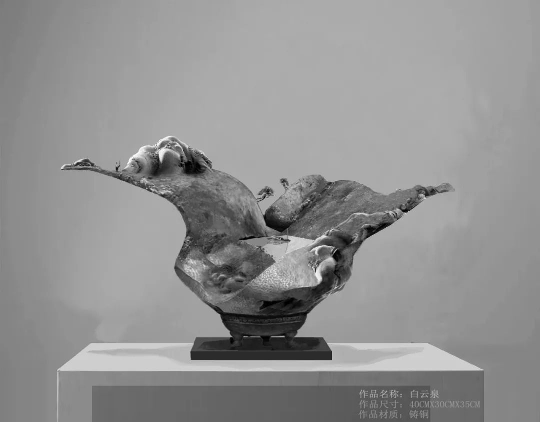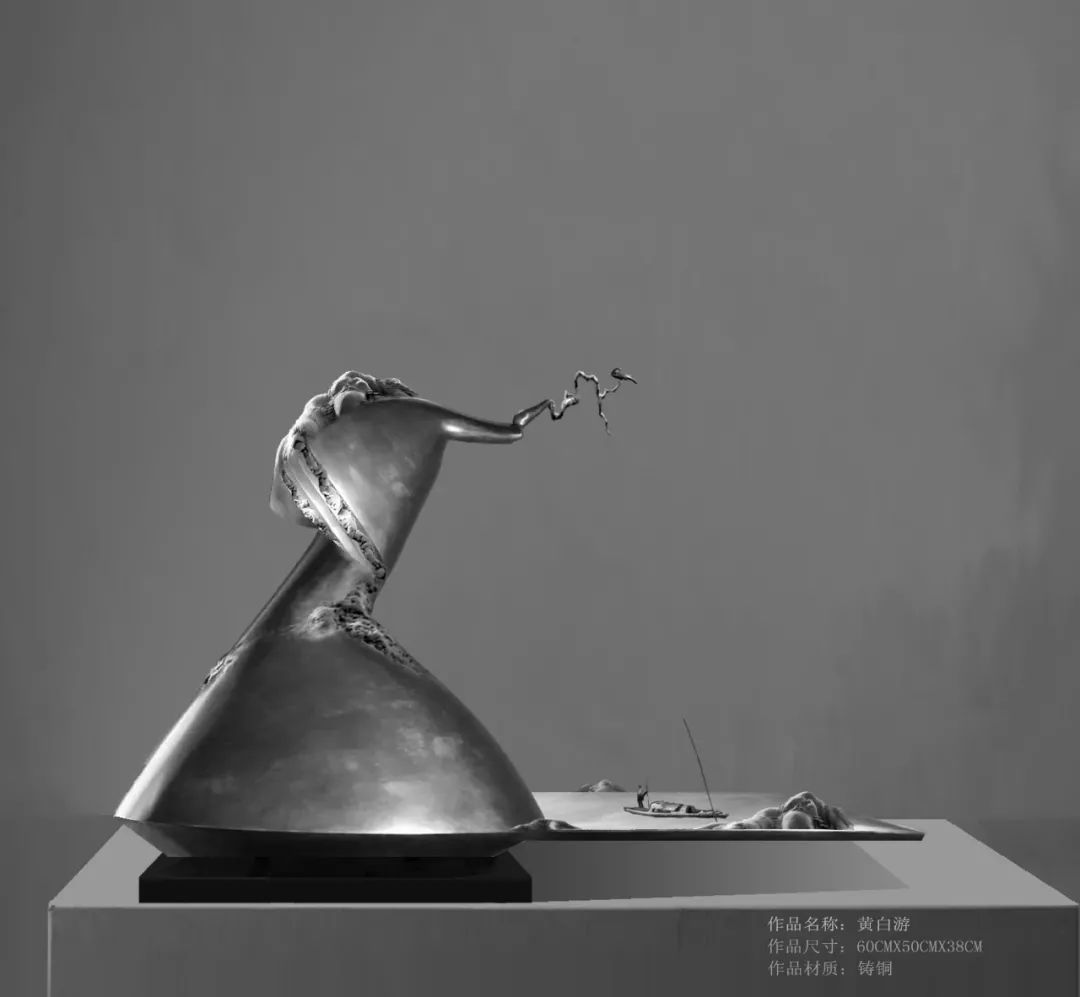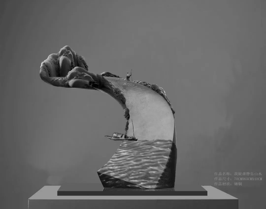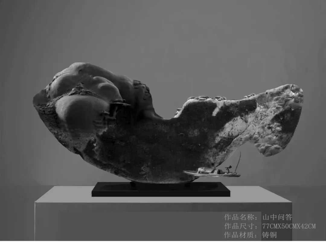 就其情调而言,依旧冷峻雅逸。如作品《白云泉》,也属铸铜作品,是一个立体的港湾,是作者心灵栖息之地。“山中何所有?岭上有白云。”而且,岭上不仅有白云,而且还有云与泉相伴。那岭上宁静的白云之泉,停泊着一叶轻舟,孤傲高雅之情,溢于言表。再如作品《山中问答》《黄白游》《江雪》《秋山》《山居秋瞑》等,皆有超然出世之怀。