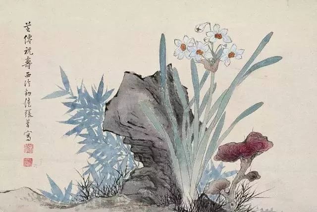 以芝仙、鹤或长春花等组成图案,即谓“芝仙祝寿”。