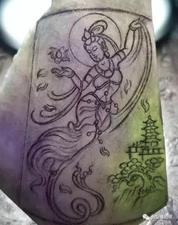 这块春带彩翡翠片料,题材是敦煌飞仙,人物画的很优美。