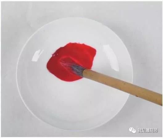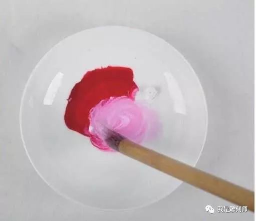 1.先在调色盘里挤上曙红,然后将羊毫笔润湿,把颜色调匀。