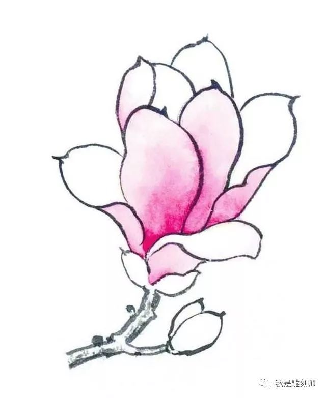玉兰花在春天开放,花瓣形状略长。在绘制玉兰花时,应先勾画出花的大致结构,然后再进行分染和罩染。勾画花瓣时中侧锋兼用,落笔要有虚有实,在转折的地方可适当地夸张一些,使勾出的线有轻重、起伏的变化。