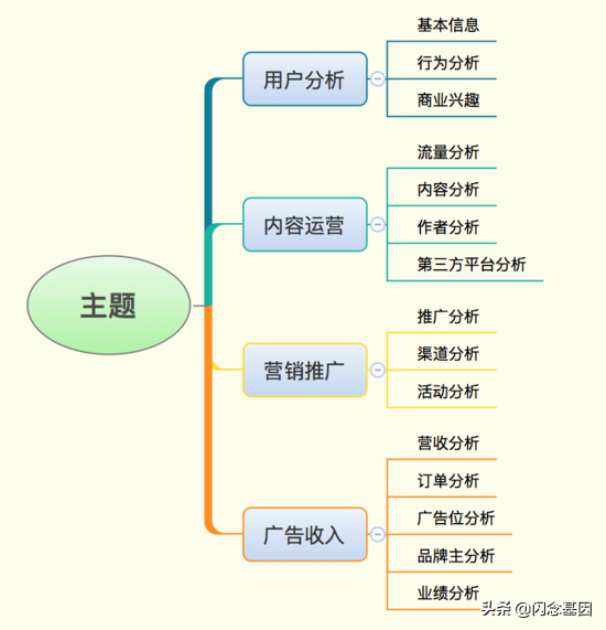 好奇心业务来说可以分为内容生产运营、营销、用户、广告收入四个方面;再对主题进一步细化出子主题,例如广告主题可以拆除订单分析、营收分析、广告位分析、品牌主分析、业绩分析,子主题也就是主题的边界。