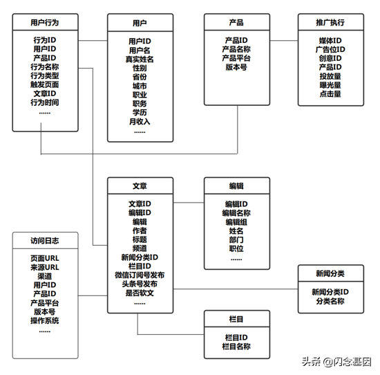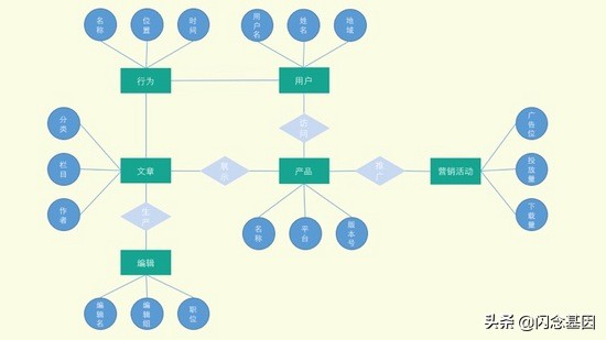 例如我们为好奇心日报提炼出产品(App、PC网站、小程序等)、用户、用户行为、文章、编辑等对象,并描述了对象之间的关系以及表述对象的核心属性。
