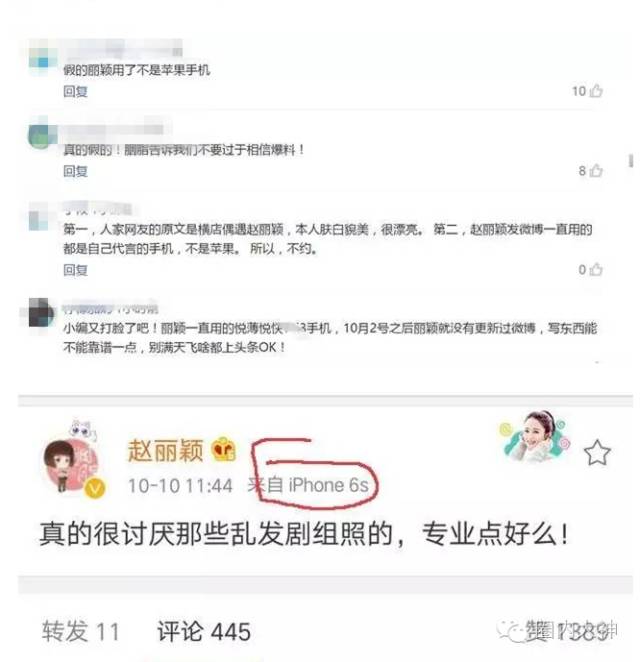 但当天发出的那条,也许是着急,赶快就发了,就连粉丝都看出来不对劲,赵丽颖竟然用着iphone 6S发布!