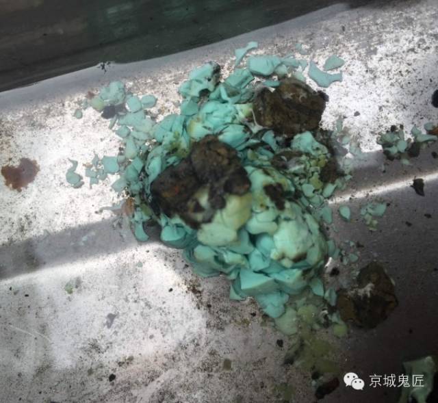 看看,有些料就是这样不给力,泡泡就碎了当然不是所有这么渣,不过泡水多日就完蛋了。在国际珠宝界绿松石注胶,注塑料,注蜡都是认可的,主要是保住颜色,解决硬度和碎裂的缺陷等。绿松石的硬度没有说的那么夸张5-6的硬度,个别的会有但不是基本硬度,基本硬度还是很低的,自己雕刻过手感肯定不会骗自己,雕刻起来感觉近似寿山石的软度但没有寿山石那么软,绝没有玉石的硬度,这是材质必然的特性,自然界有很多类似绿松石材质特点的石头,全部都是这样的硬度和成品效果,这是大自然形成因素特点不是人类说了算的。