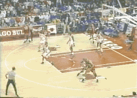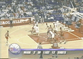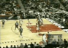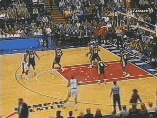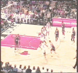另一种是运球用屁股顶开防守,向三秒区方向的跳步后仰(巴胖极少勾手,大多投篮以投篮完成)