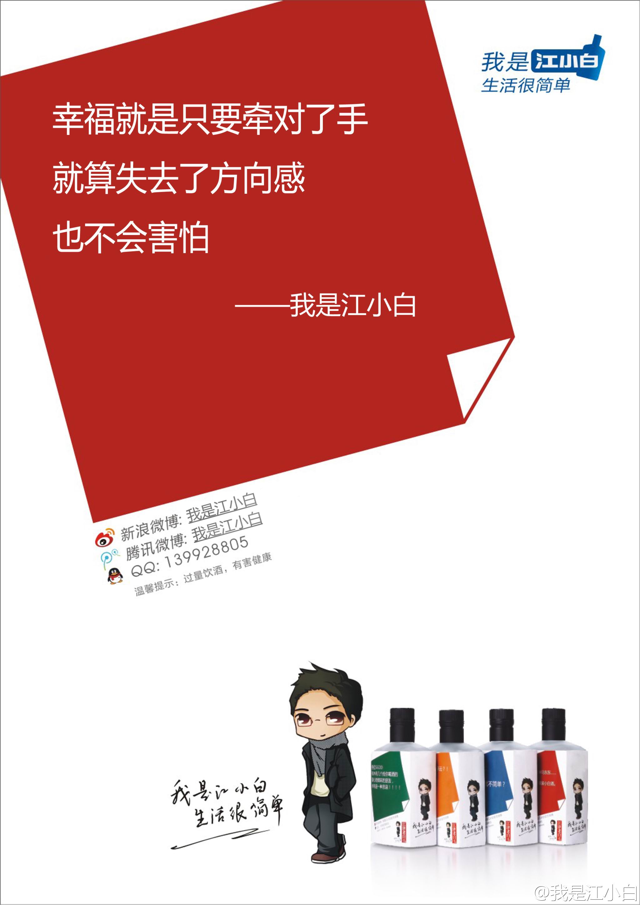 2从口号来说,江小白的口号朗朗上口,读过就能使人记住。在欲望横流的现代社会,生活压力大是一个很显著的特征。面对压力,谁不想过简单的生活呢?于是,“我是江小白,生活很简单”很快就会被人们熟知并且深入人心,能够拉近和消费者之间的距离。