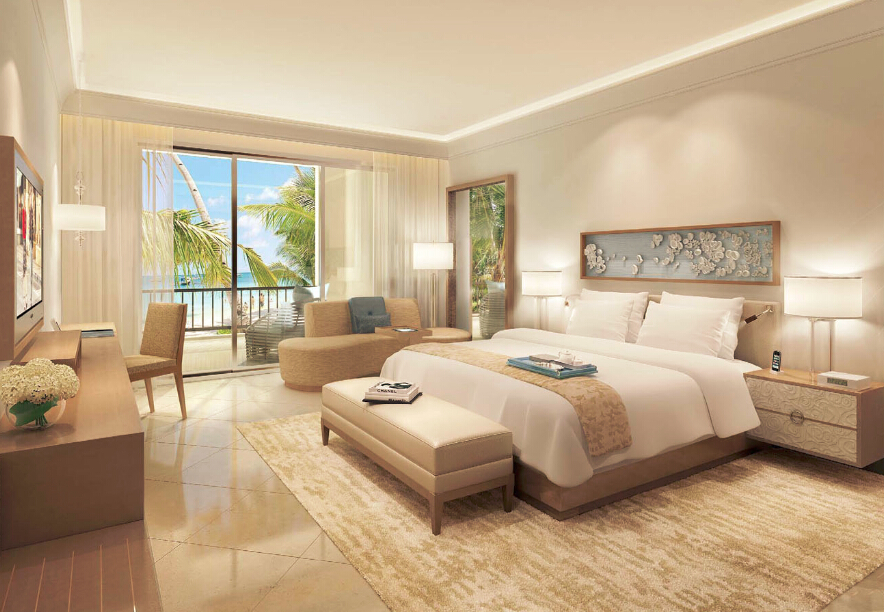 酒店客房设在二层及三层以上,U字形的布局,使客房尽可能欣赏到海景。8层设行政酒廊,9层设总统套房。酒店房型多样,房间格调高雅。包括29间格调高雅的套房,面积从38平方米至506平方米不等,均设有观景阳台,所有房间均可欣赏阳光海滩的闪耀海景或优美静怡的花园景致。